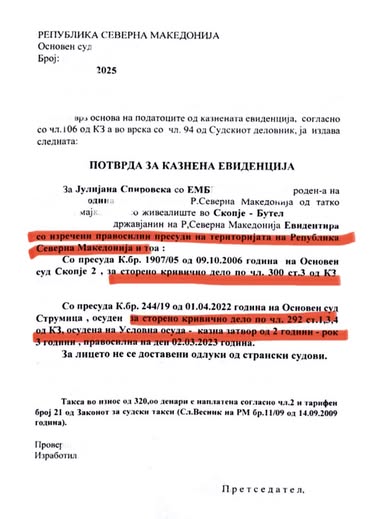 Таа објави фотографија од казнена евиденција на Спировска, за која вели дека „со кривично досие за ХАОСОТ што го предизвикува во Комунална хигиена ќе биде наградена со советничко место во општина Бутел“.